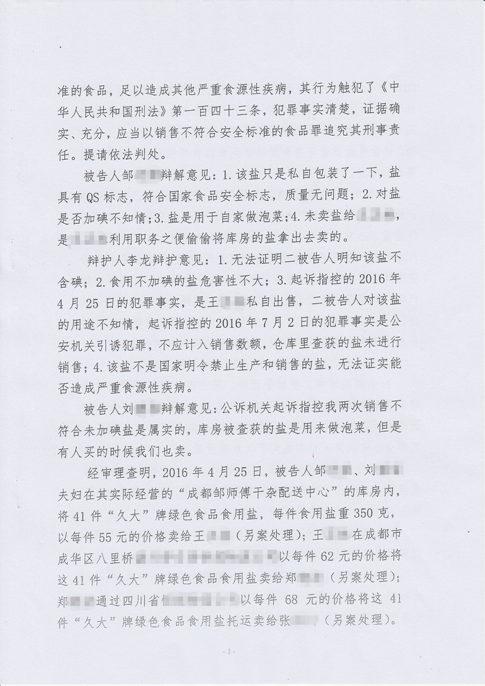 鹽改政策出台後,一些人受利益驅使,缺乏法律意識,不顧消費者健康權利,将不符合加碘食用鹽質量标準的劣質鹽流入市場銷售。本案,被告人鄒某、劉某2016年4月購進未加碘食用鹽,明知非碘鹽和不合格碘鹽禁止在缺碘地區食用鹽市場銷售,銷售不符合安全标準的食用鹽,足以造成嚴重食源性疾病,其行為均已構成銷售不符合安全标準的食品罪,且系共同犯罪。不合格食鹽在銷售過程中,被巴中市鹽政稽查處查獲,因涉嫌犯罪,巴中市鹽政稽查處移交公安機關偵查,最終于2017年6月,經法院審理依法追究鄒某、劉某的刑事責任。