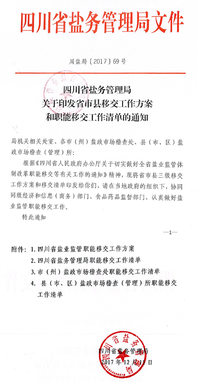 2017年12月28日下午,四川省鹽業體制改革工作聯席會議辦公室根據省政府分管領導的指示召開職能移交工作座談會,移交省鹽業總公司、現省鹽務管理局承擔的行政職能。