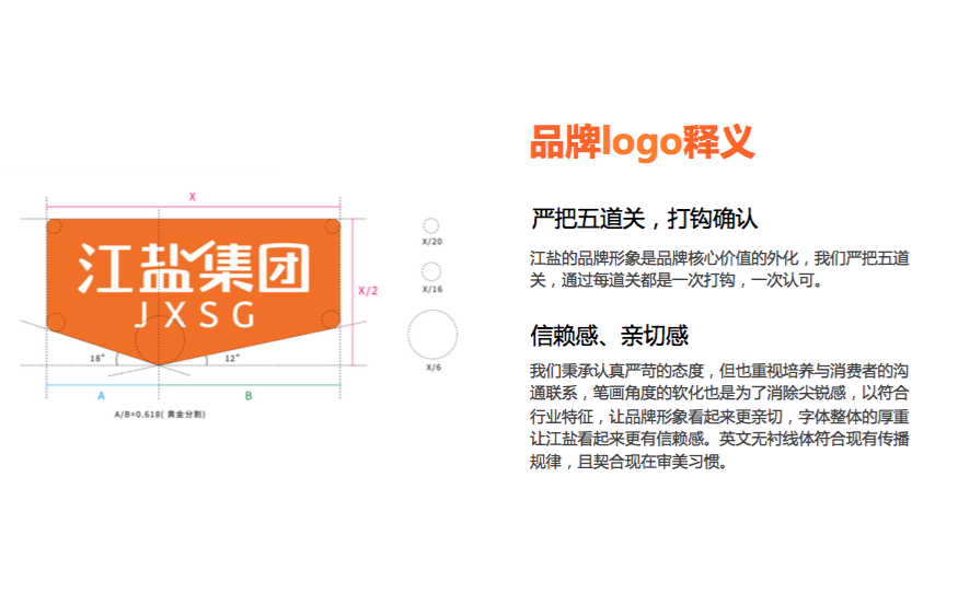 江鹽認真負責,從源頭到餐桌,嚴把生産、包裝、儲運、銷售、服務五道關,從這一品牌核心出發,我們完成了江鹽集團品牌标識的設計。