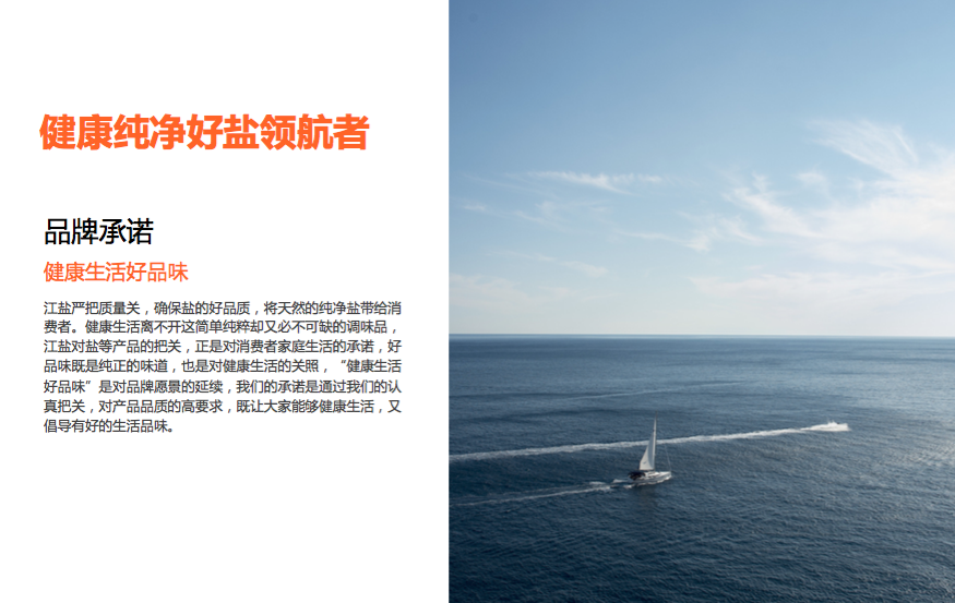 品牌必須具備一定特殊品質、穩定性并實行某種标準,才能經得住時間與實踐的考驗。江鹽放大産地禀賦這一不變特性,選擇暖色系裡最活潑溫暖的橙色作為江鹽的品牌主色,保證了江鹽品牌及産品的超強識别性。