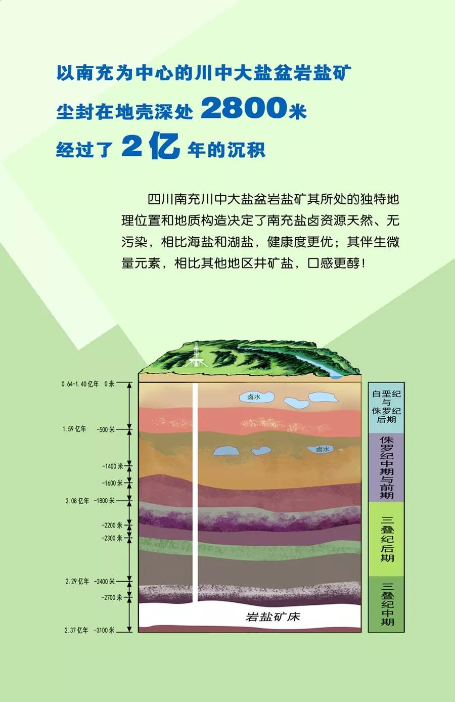 深井晶鹽源自我公司自有礦山,地處川中鹽盆的核心地帶,岩鹽礦埋藏深度2800米,經過2億年沉積,礦床資源品質優,無有毒有害物質伴生,遠離工業污染源。