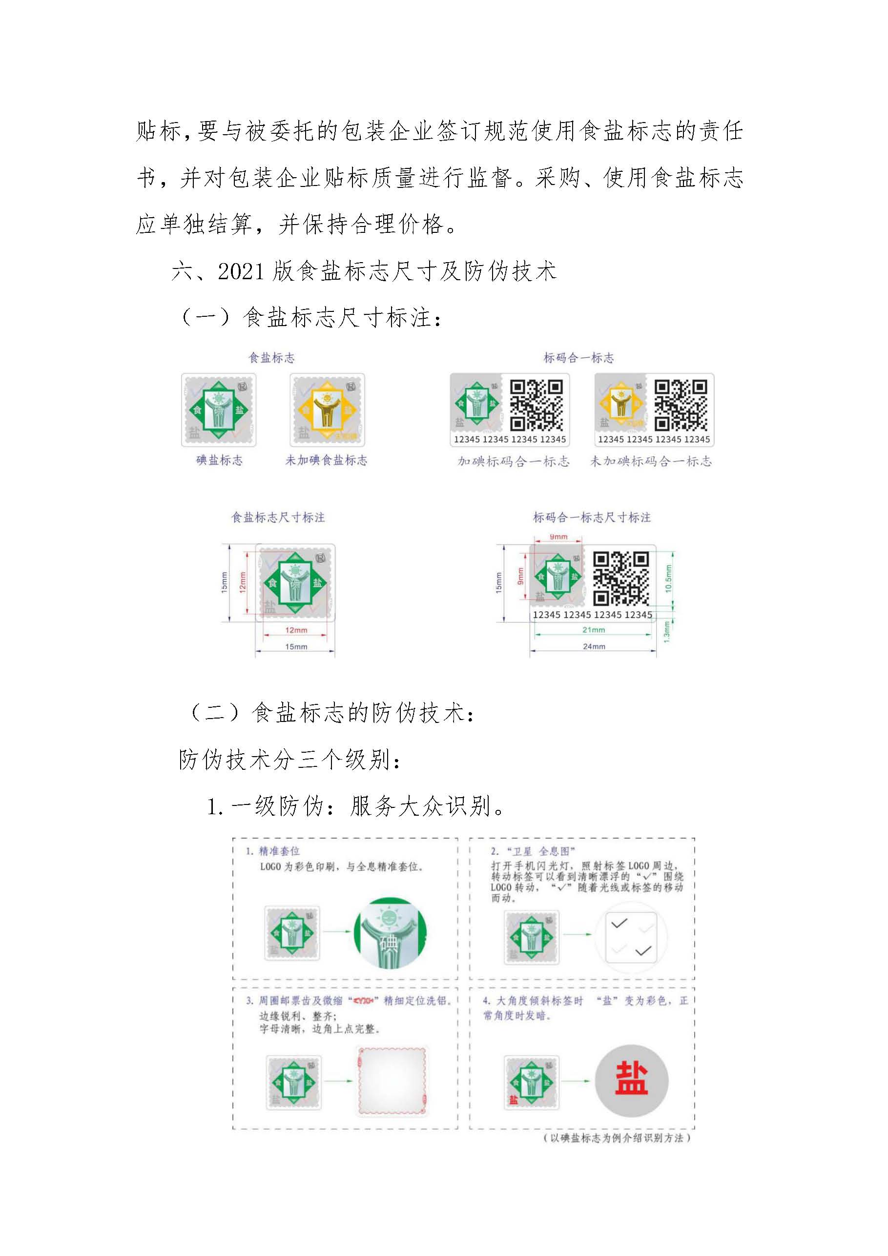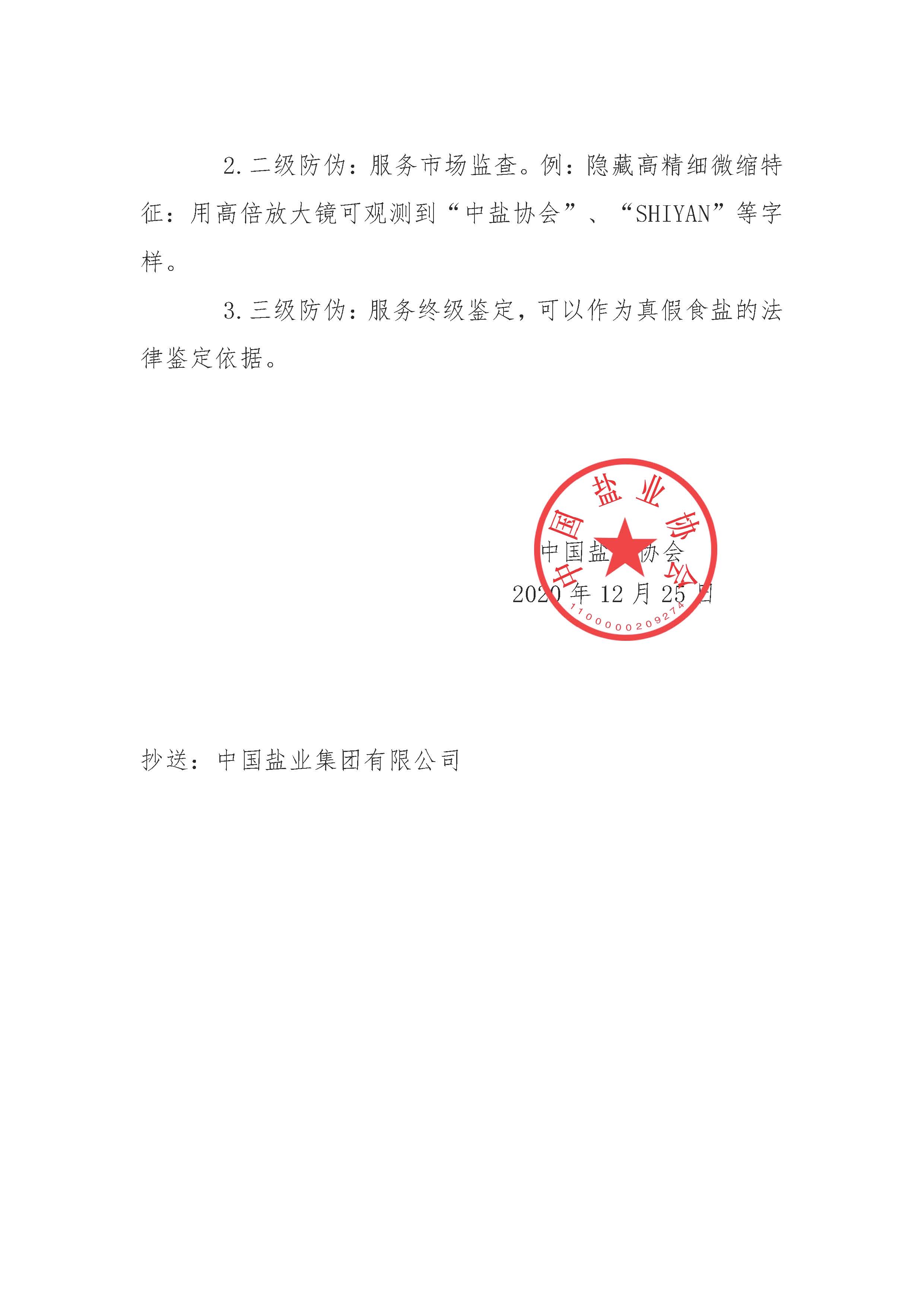 随着時代發展和信息技術的飛躍進步,現有的食鹽标志防僞技術含量和其他功能略顯滞後,難以有效保證食鹽質量安全、支撐食鹽電子防僞追溯的客觀需求,消費者直觀上也難以識别,為有效化解上述問題,充分保證食鹽質量安全和供應安全,實現食鹽産品的有效追溯和市場甄别,中鹽協會決定在保留激光全息防僞技術的基礎上,增加更高級的防僞技術,形成一袋一标碼,既能更好地滿足防僞甄别、追根溯源的需要,又經濟實用、便于在行業内推廣。2020年,中鹽協會面向全國公開征集食鹽标志防僞技術方案,之後經過初選和複選,确定了最佳方案。此次采用的防僞技術分三個級别,一級防僞服務大衆識别;二級防僞服務市場監查,隐藏高精細微縮特征,用高倍放大鏡可觀測到“中鹽協會”、“SHIYAN”等字樣;三級防僞服務終級鑒定,可以作為真假食鹽的法律鑒定依據。使用了新版防僞技術的食鹽标志有三種,即綠色LOGO版(代表碘鹽)、黃色LOGO版(代表未加碘鹽)以及标碼合一版。新版防僞技術把具有追溯功能的二維碼和帶有激光全息防僞功能的碘鹽、未加碘食鹽标志印刷在一起,LOGO為彩色印刷,與全息精準套位,傾斜或轉動标志可以看到清晰漂浮的“√”圍繞LOGO轉動,點光源或光線直射時更清晰,周圍郵票齒孔以及微縮的“ZYXH”精細定位,邊緣銳利、整齊,大角度傾斜标志時,“鹽”變為彩色,正常角度時發暗。