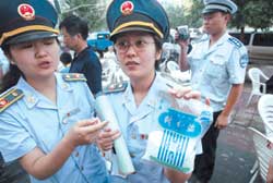 (2004-7-2《北京娛樂信報》記者 張薇/文并攝) 昨晚7時,記者随同豐台區工商局、城管大隊、衛生監督所和公安分局等部門,來到光彩路的北京中鐵聯合購物中心檢查時,在一家攤位上發現了一包用了一半的假鹽。檢查人員告訴記者,這樣的假鹽一般都不含碘,有的還含有對人體有害的成分。檢查中還發現,這裡的攤位都沒有營業執照,銷售人員也沒有健康證。執法人員當場責令該大排檔停業。